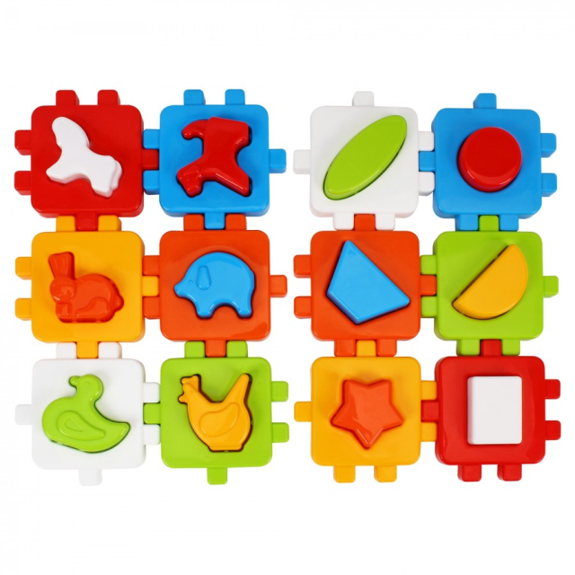 Цветные кубики с фигурками и возможностью соединения между собой превращают игру в интересное обучение без принуждения.